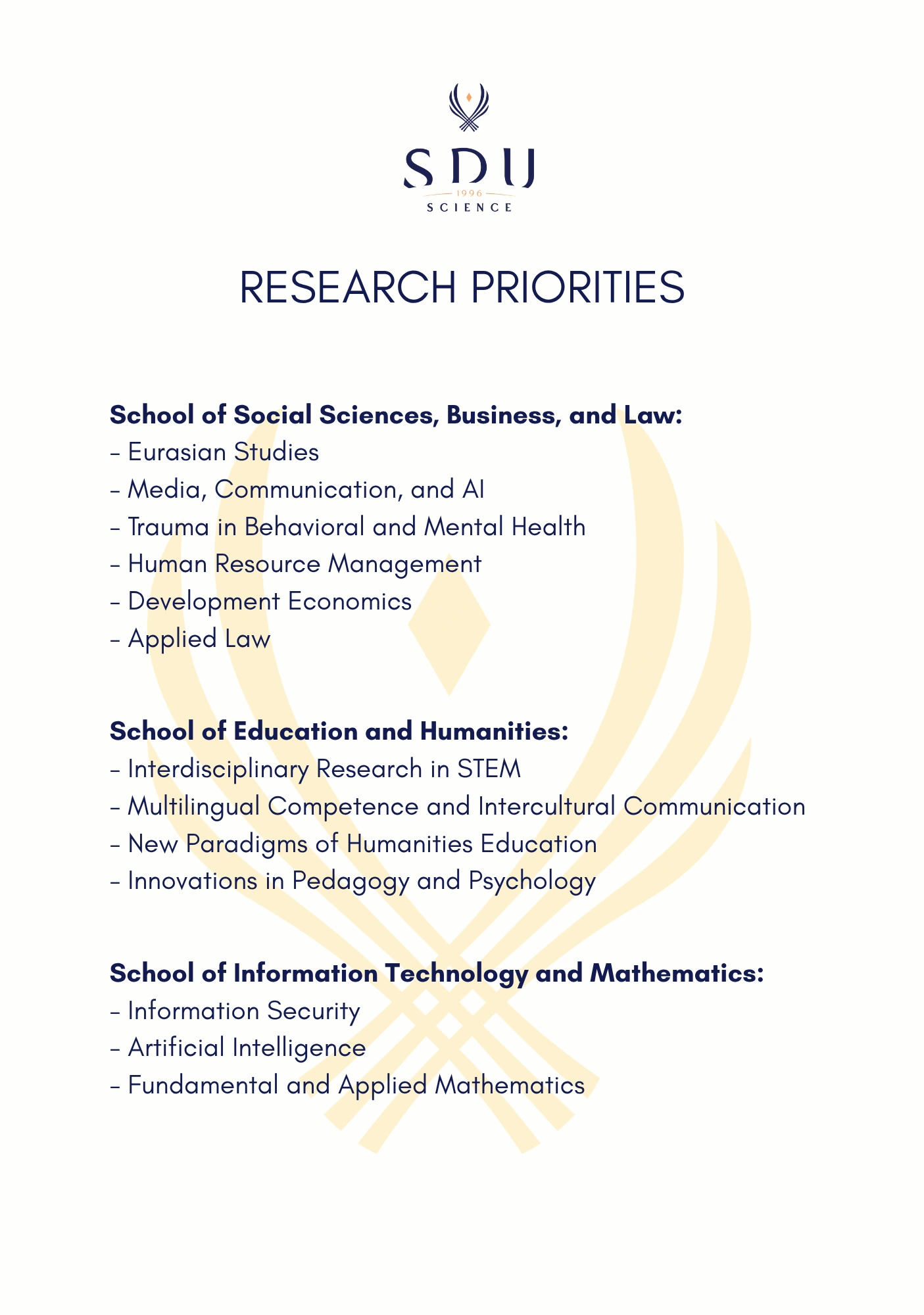1. Support Research Internship Program. Faculty members develop academic curriculum and research at the University. Within the framework of this program SDU provides faculty members with the opportunities to do research abroad. Your donations will cover flight expenses, accommodation and monthly salary from 6 months up to 1 year. SDU also invites professors from abroad to share their knowledge and experience with local faculty and students.