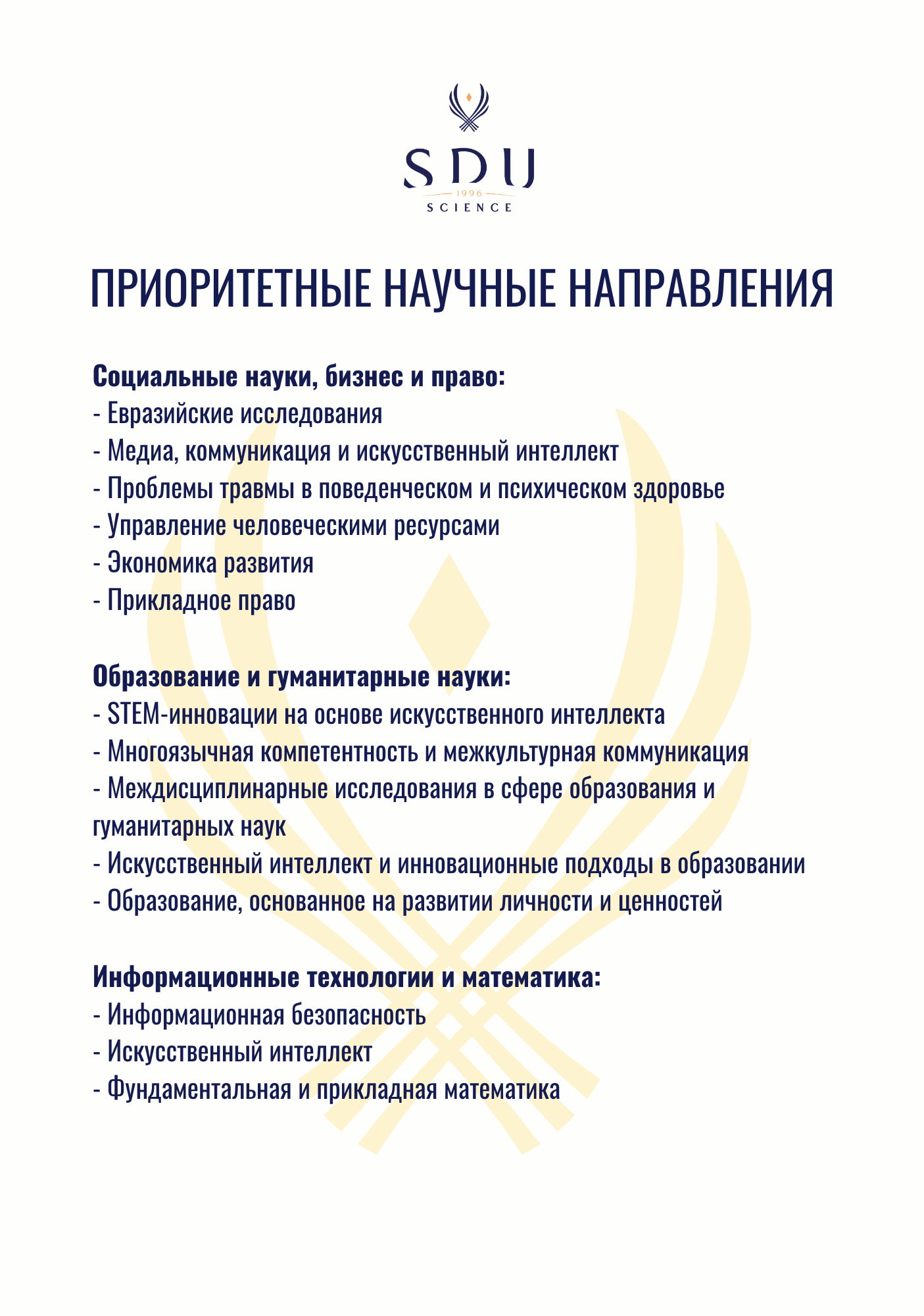 “Жас маман”бағдарламасын қолдау. “Жас маман” бағдарламасы СДУ үздік түлектерін іріктеу және оқытушылардың ассистенті ретінде академиялық мансабының бастапқы кезеңінде оларға көмек көрсету арқылы университеттің адами капиталын дамытуға бағытталған. Жас мамандар шетелде докторлық дәреже алуға және беделді университеттерде бай ғылыми зерттеу тәжірибесін алуға ынталандырылады. Оқытушылардың ассистенттері профессорлық-оқытушылық құрамнан стипендиялар мен кәсіби кеңестер алады.